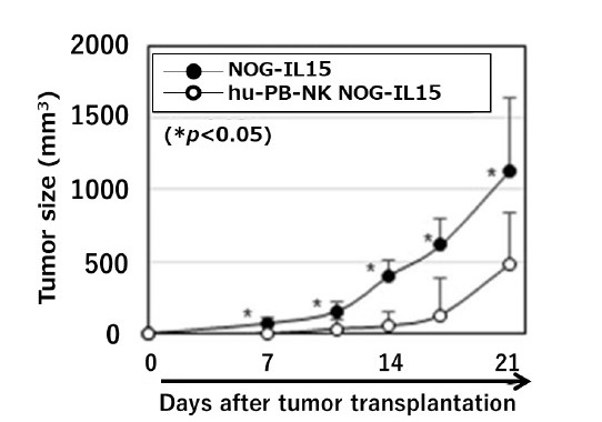 NOG-IL15 mice engrafted with cultured human peripheral blood NK cells significantly suppressed the proliferation of the transplanted K562 cancer cell line compared to NOG IL15 mouse not transplanted with human peripheral blood NK cells.